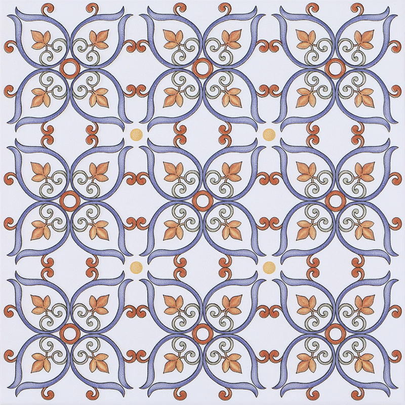 في وسط نمط البلاط الروستي السيراميكي المقاوم للنزلق ، هناك شكل زهرة محاط بالخطوط الزرقاء الداكنة ، مع أوراق تتألق إلى الخارج. يشبه التصميم المركزي زهرة شمس ،والذي هو في نفس الوقت حيوي ومتدرجوتحيط بها أوراق وأوراق العنب في ظلال برتقالية وخضراء